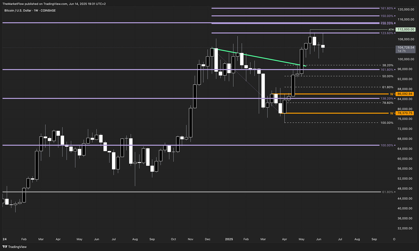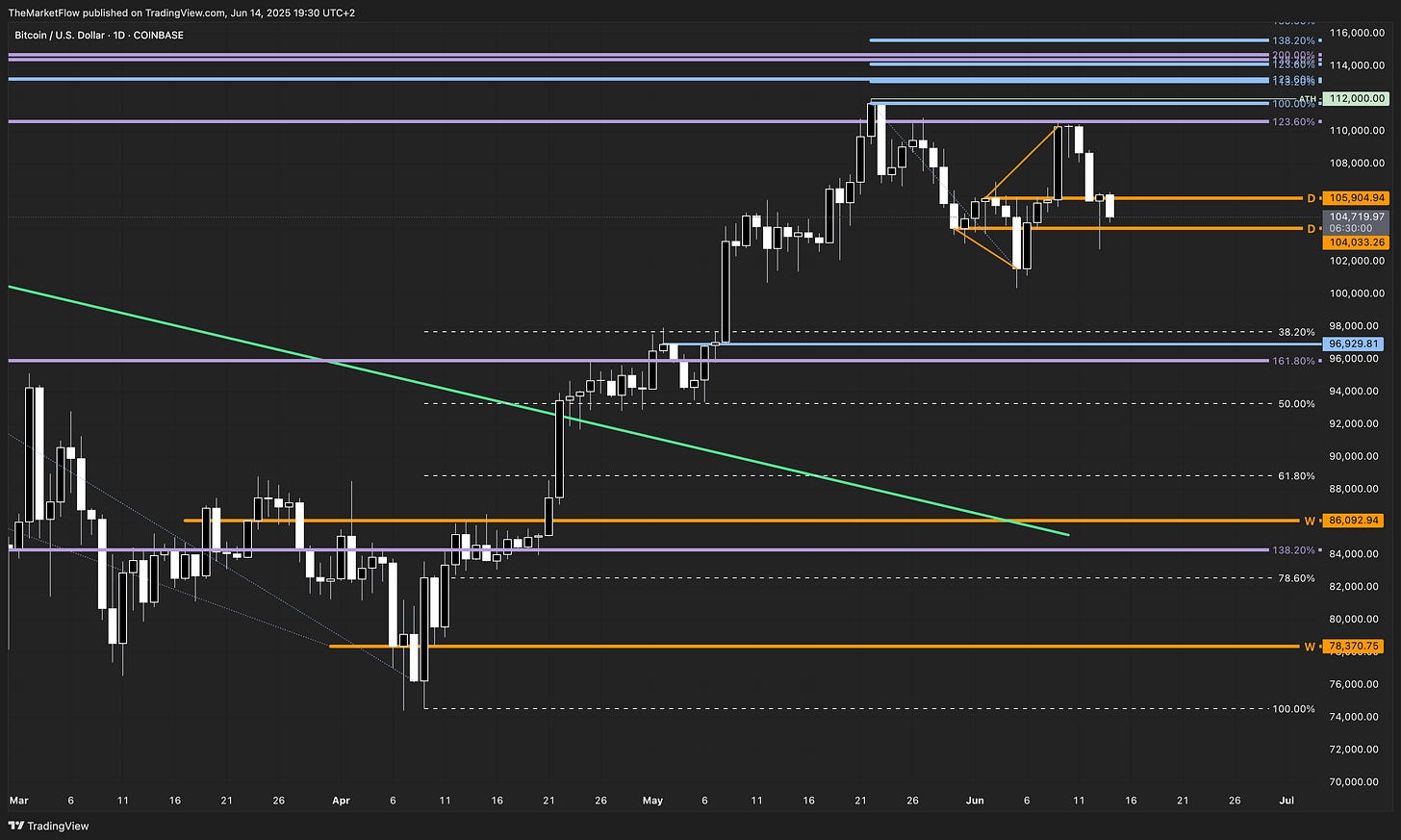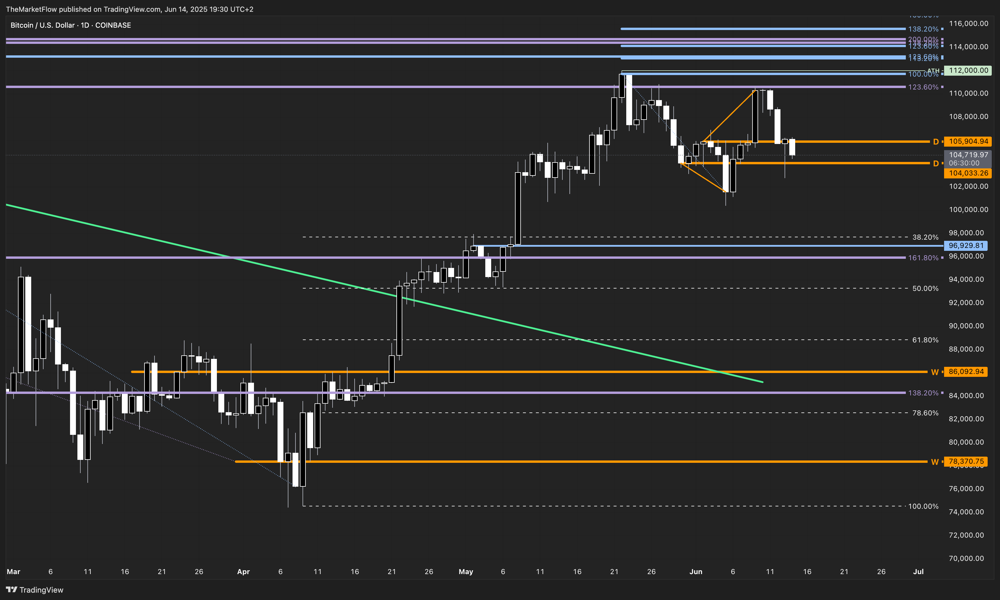 Key zone to watch: The orange daily pivot band around 104–106K – a battleground for short-term direction
