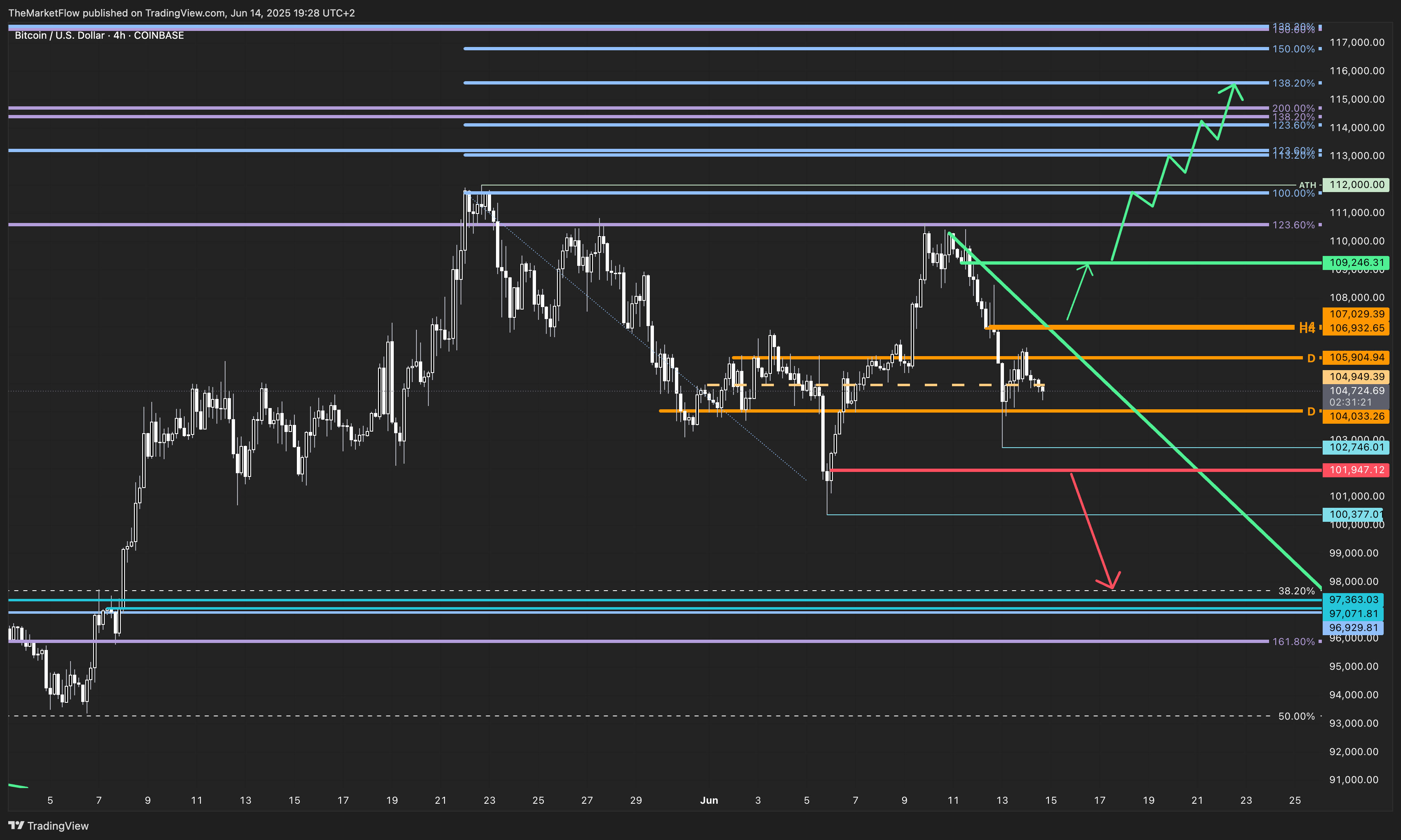On the long side, bulls need to reclaim the H4 pivot zone and break the countertrend line decisively. A clean H4 breakdown level (green) marks the start of a potential expansion phase. Once broken, it would validate a renewed bullish expansion targeting the daily and weekly Fibonacci levels, with 112,000, 114,000, and beyond.