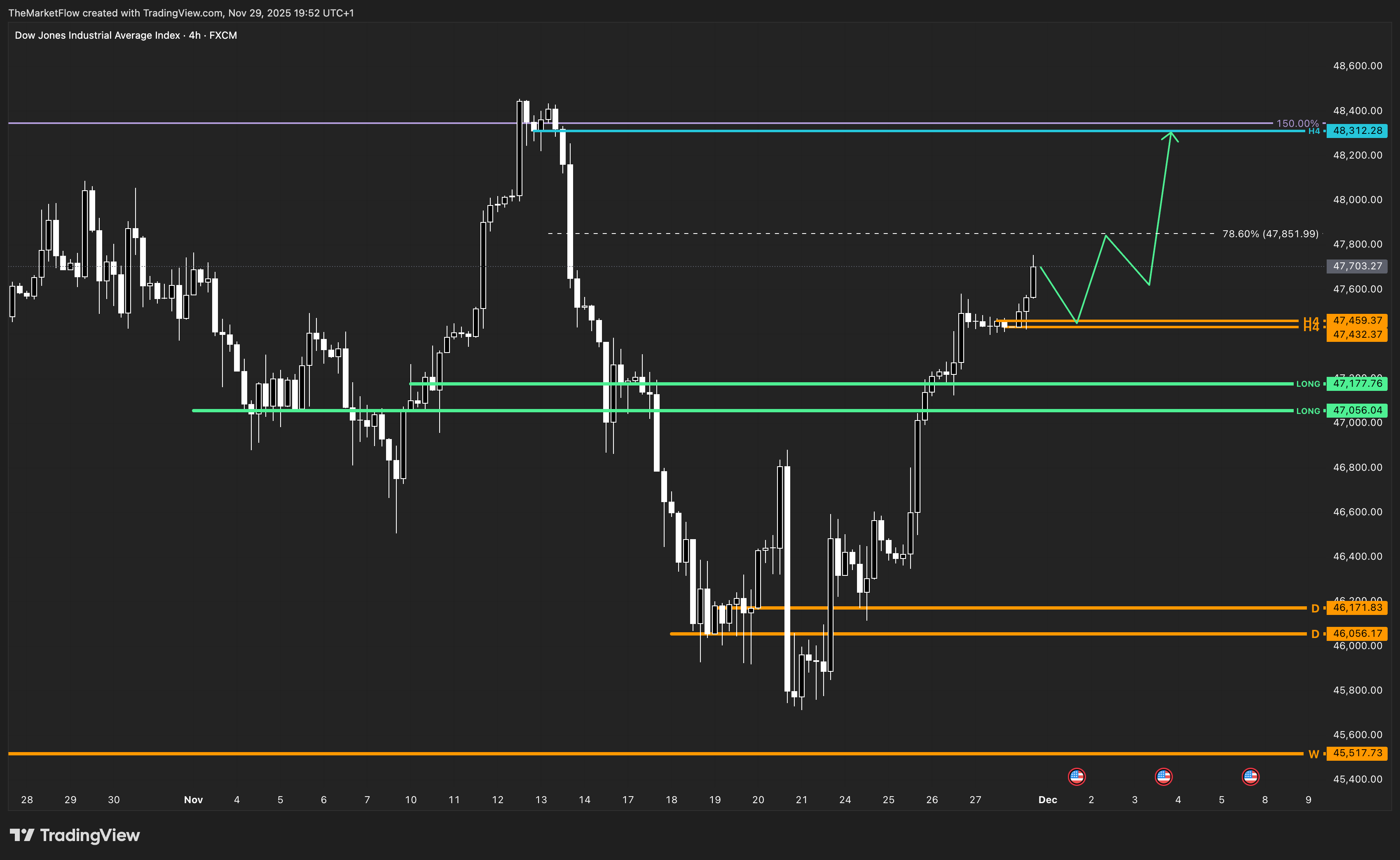 Bias long while H4 holds above the 47,432–47,459 pivot zone; invalidates on an H4 close below this area.