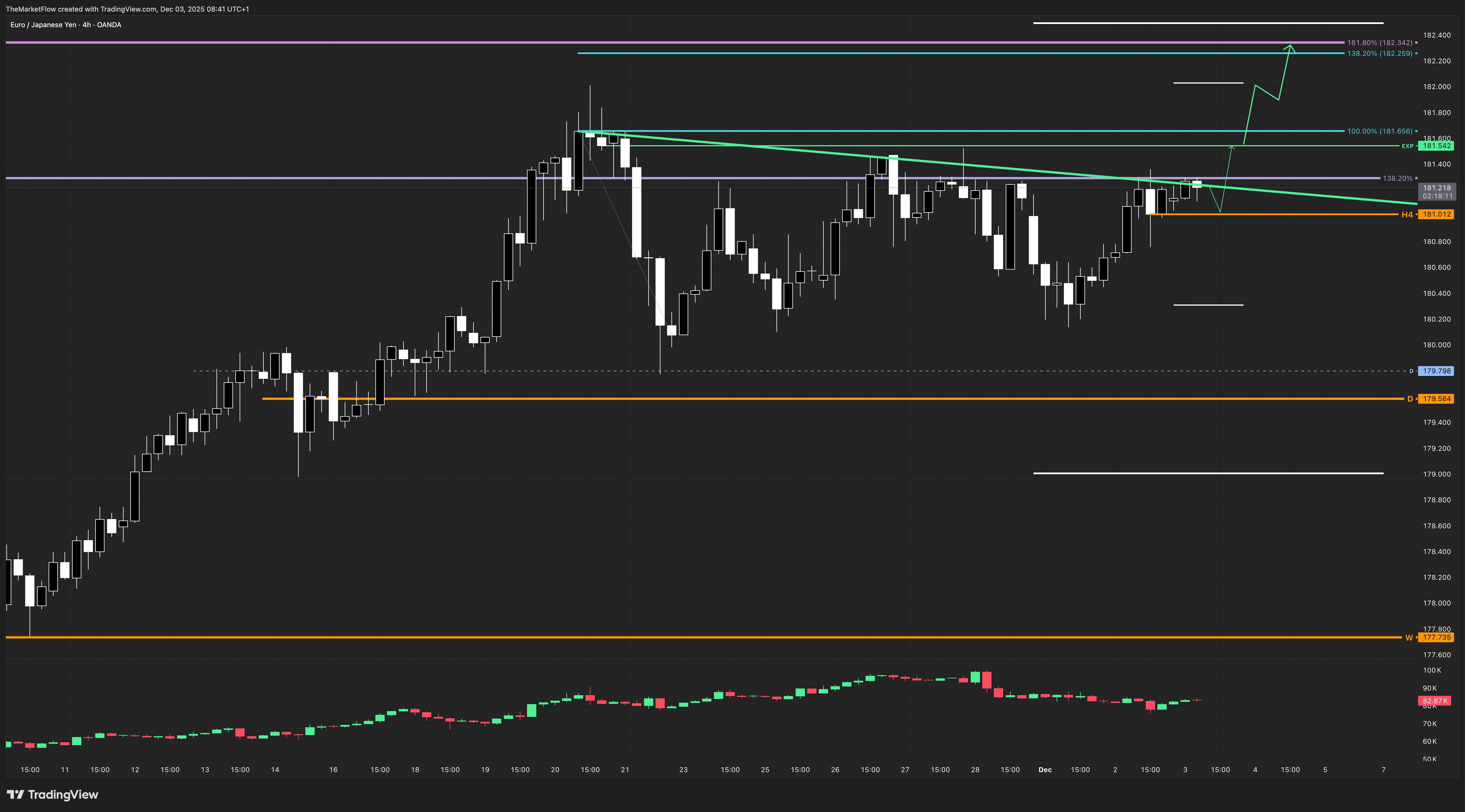 Price is compressing beneath a declining H4 countertrend line; a full acceptance above 181.542 transitions the market from compression into expansion toward upper Fibonacci objectives.