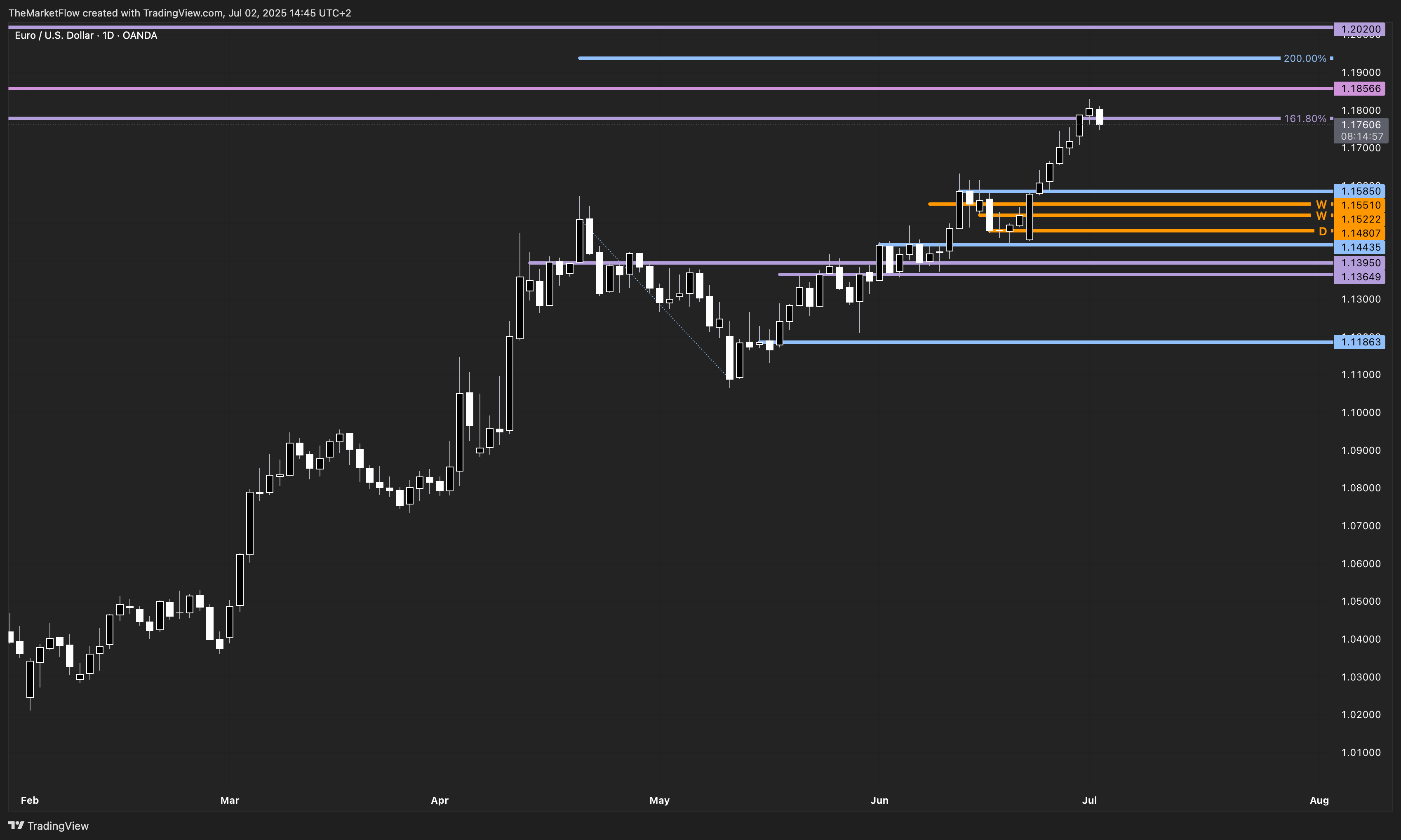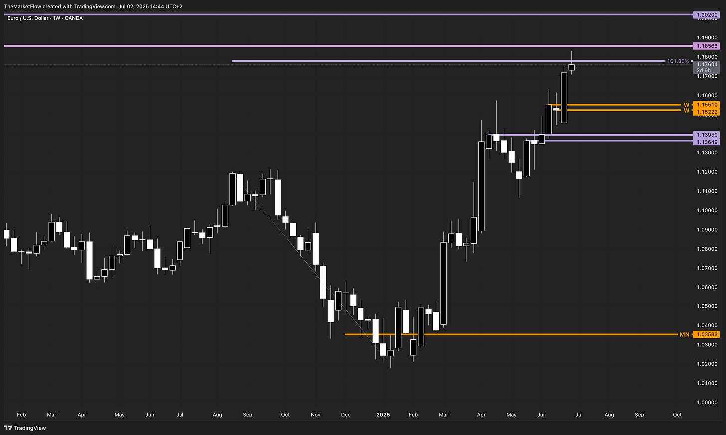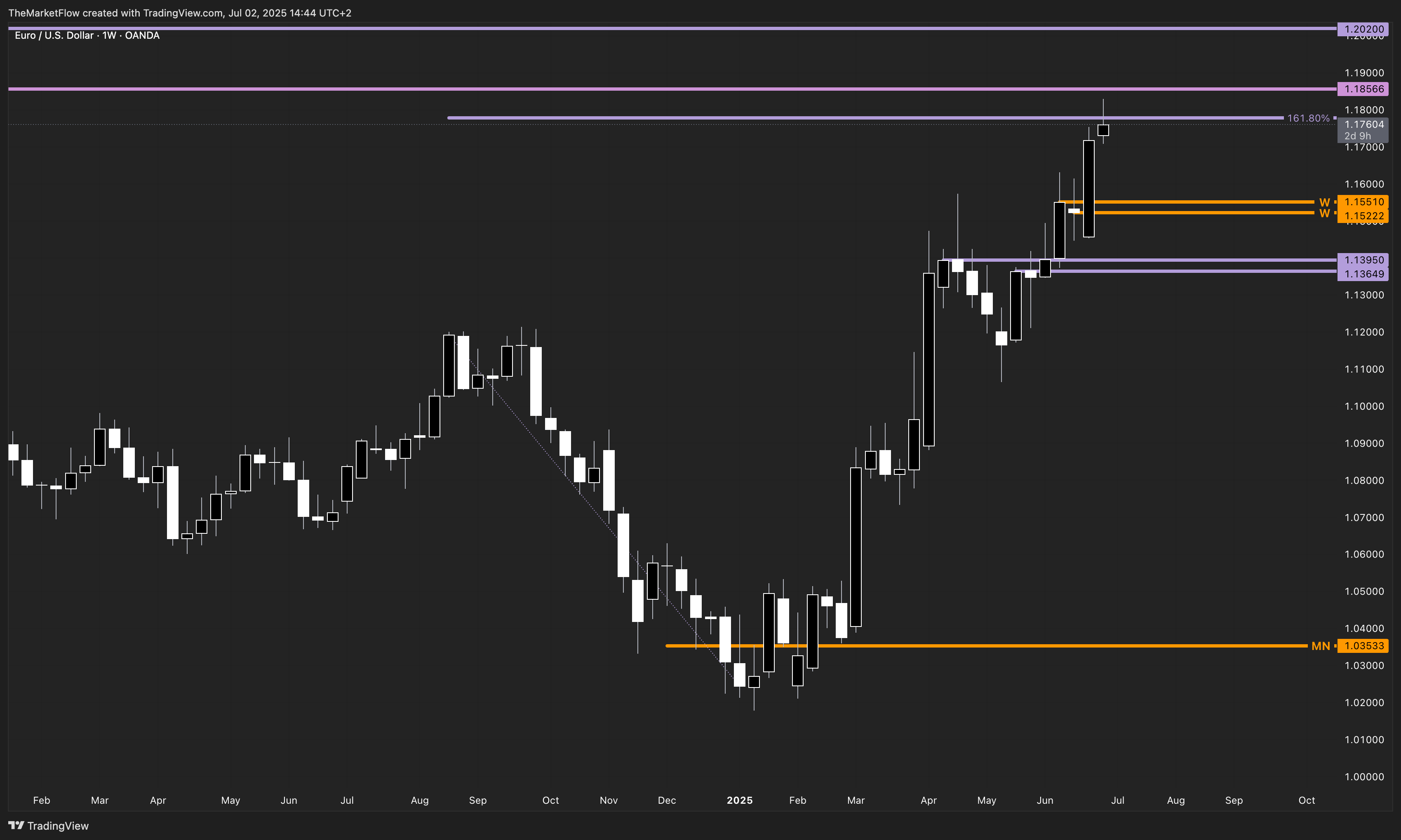 On the monthly and weekly charts, the long expansion phase remains intact. The current leg has reached a critical resistance at 1.17777 (Weekly 161.8%), slightly below the Monthly breakdown at 1.18566. This zone may act as a supply area and cause a short-term pause or reversal, particularly if lower timeframes confirm structural breaks.