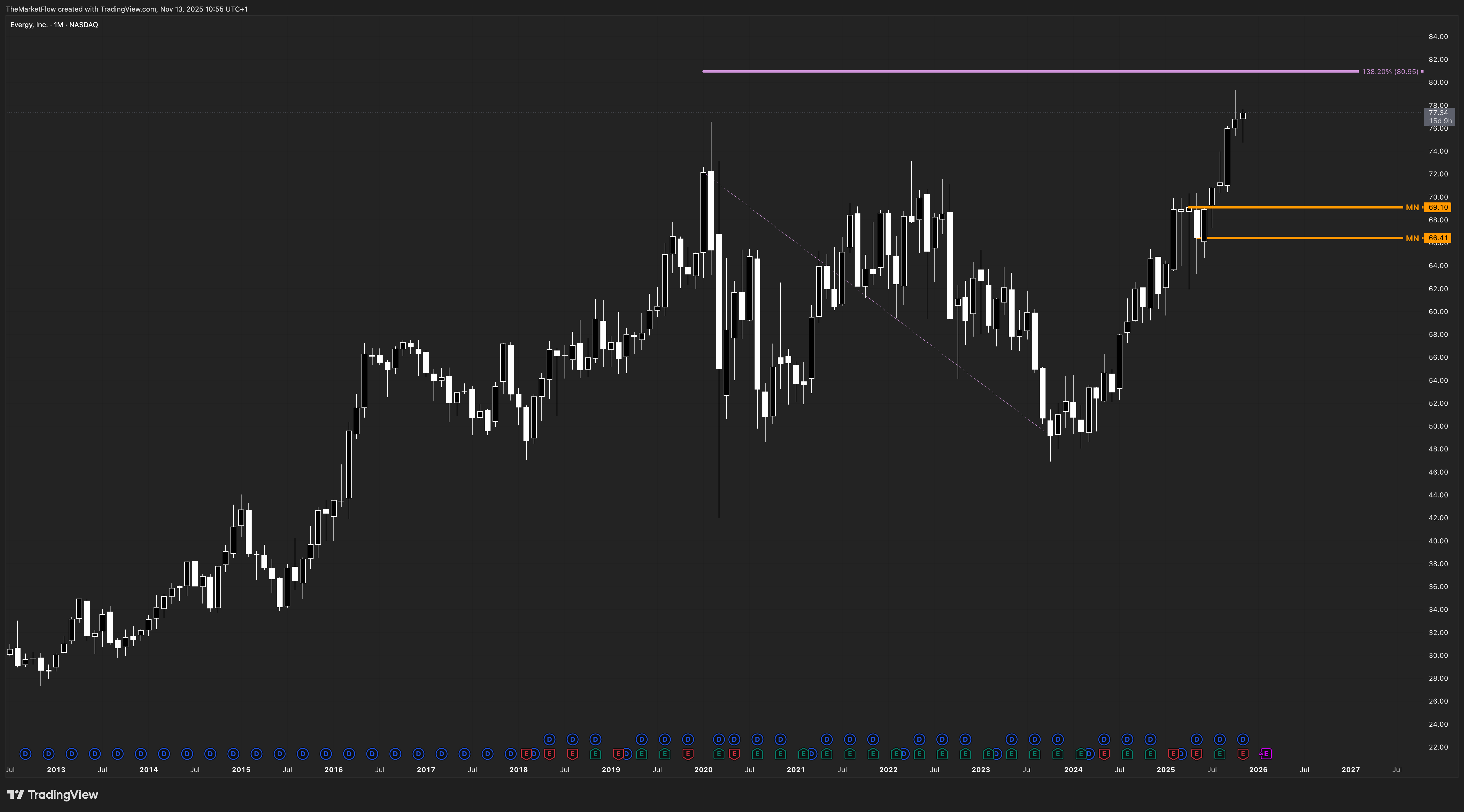 Evergy Inc. is an integrated electric utility serving residential, commercial, and industrial customers across Kansas and Missouri. Revenue is primarily generated through regulated electricity sales supported by a stable rate-base structure. The company operates a diversified generation fleet spanning coal, nuclear, natural gas, wind, and solar, with ongoing investment in grid modernization and renewable capacity.