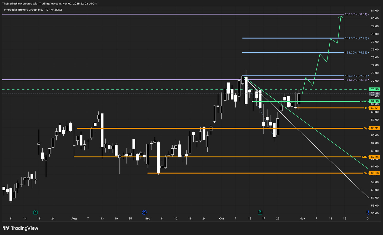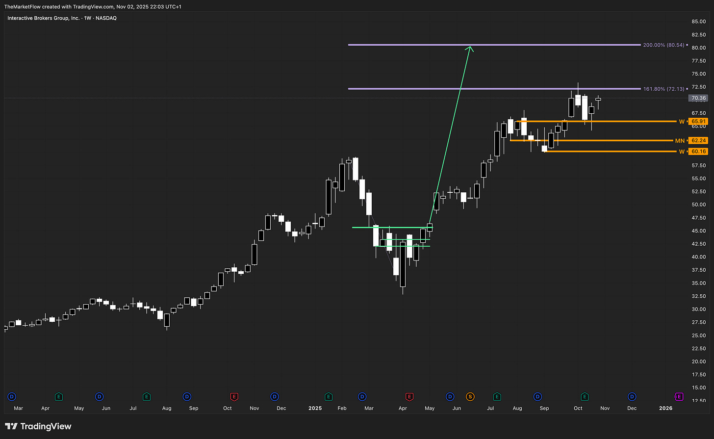 IBKR maintains structural expansion across all observed timeframes. Confirmation above the daily trigger sustains upward flow toward 200% Fibonacci extensions. Only a confirmed daily close below 68.51 would invalidate the current bullish structure and reclassify the setup into correction.