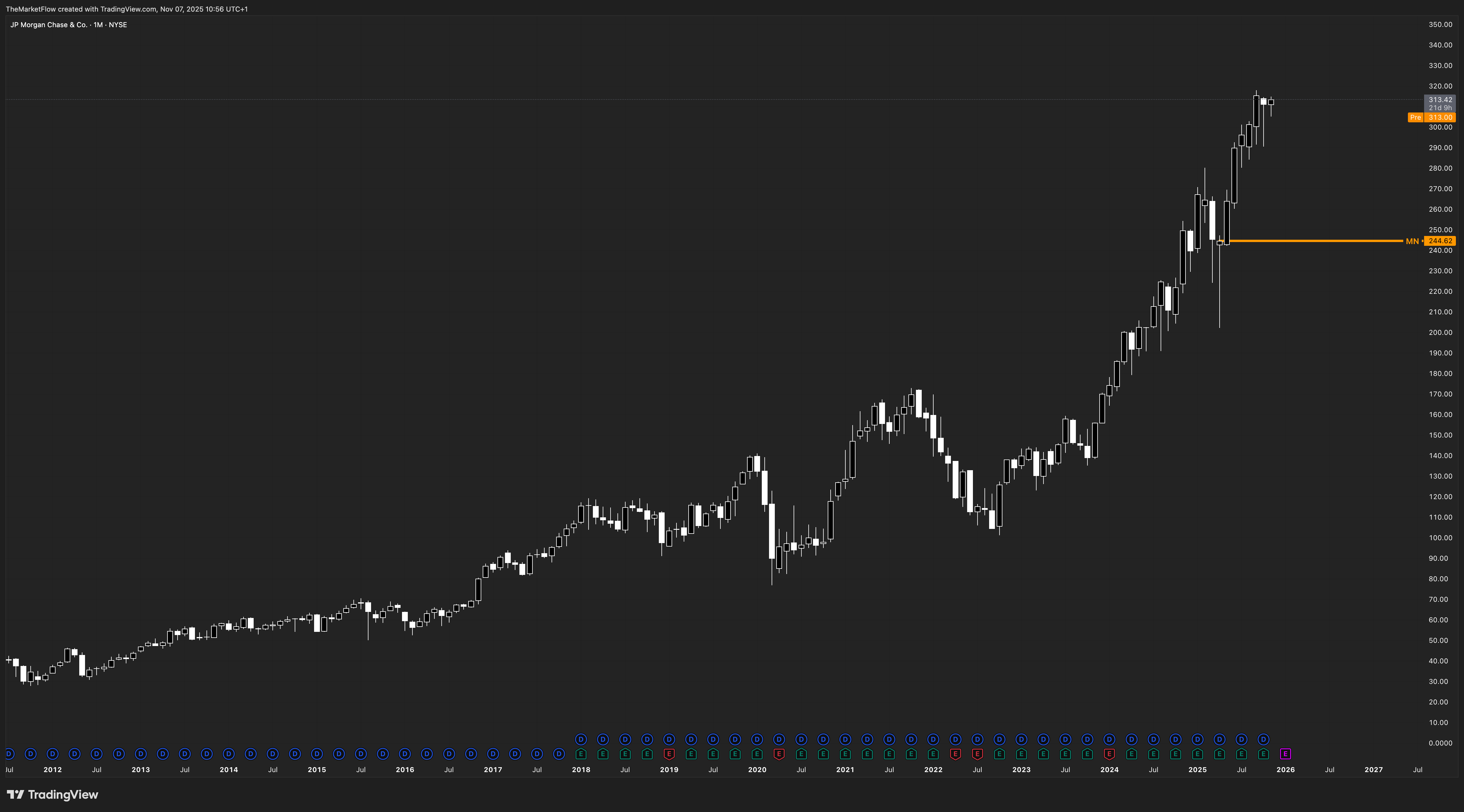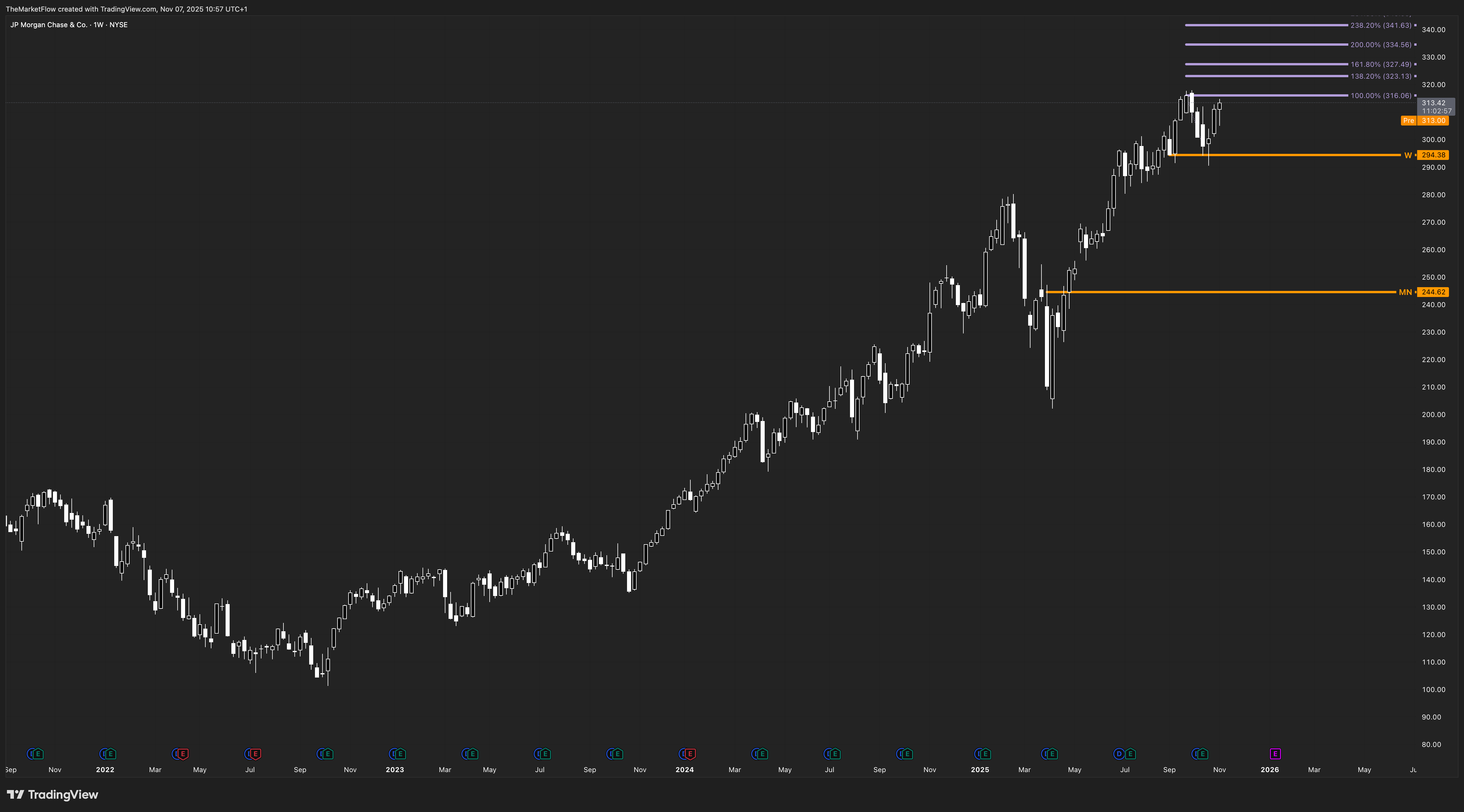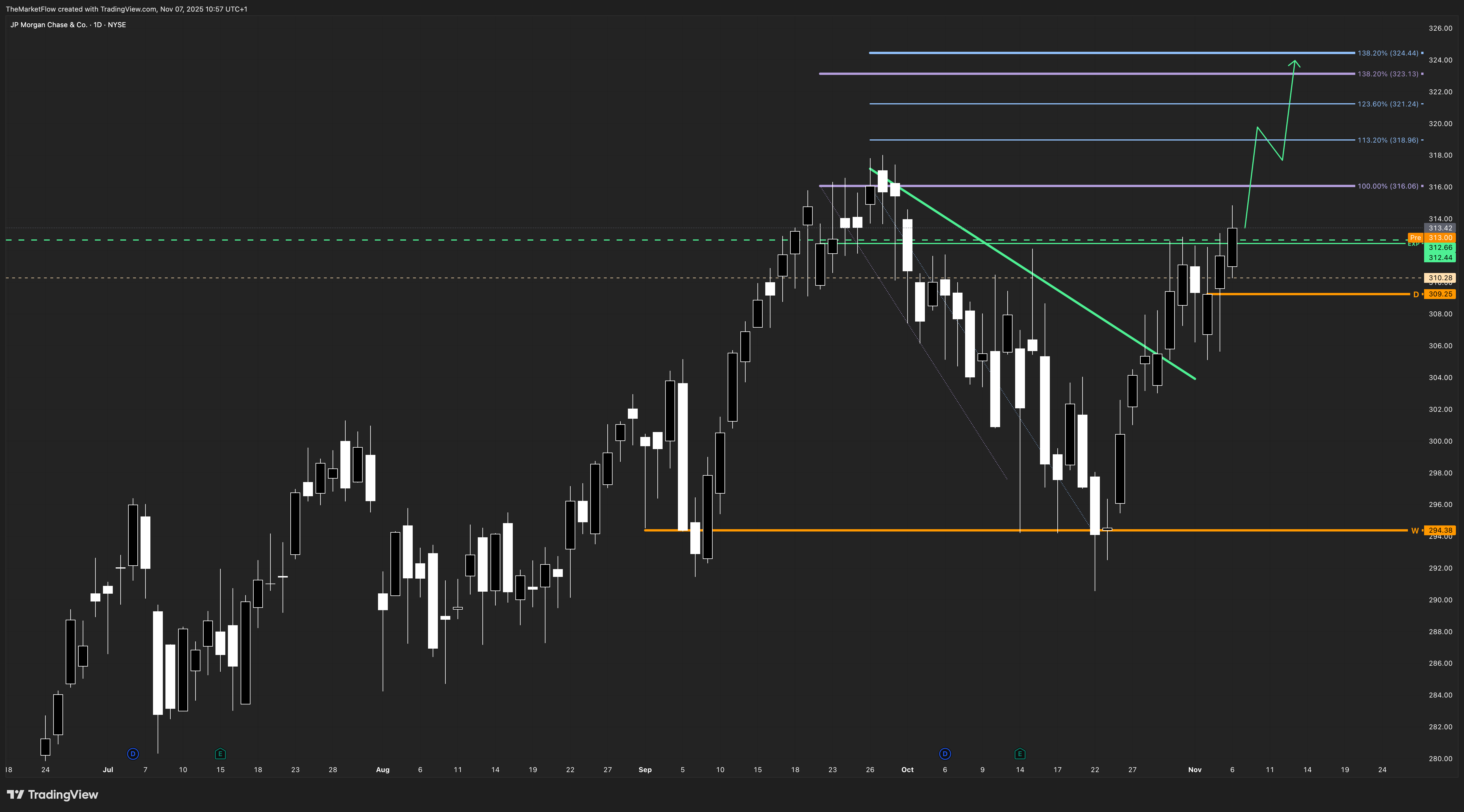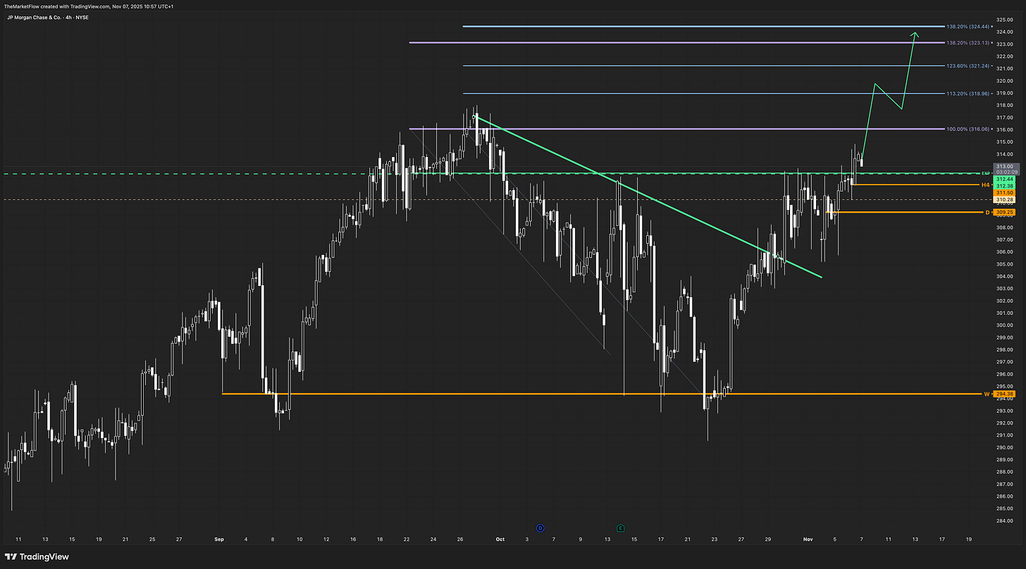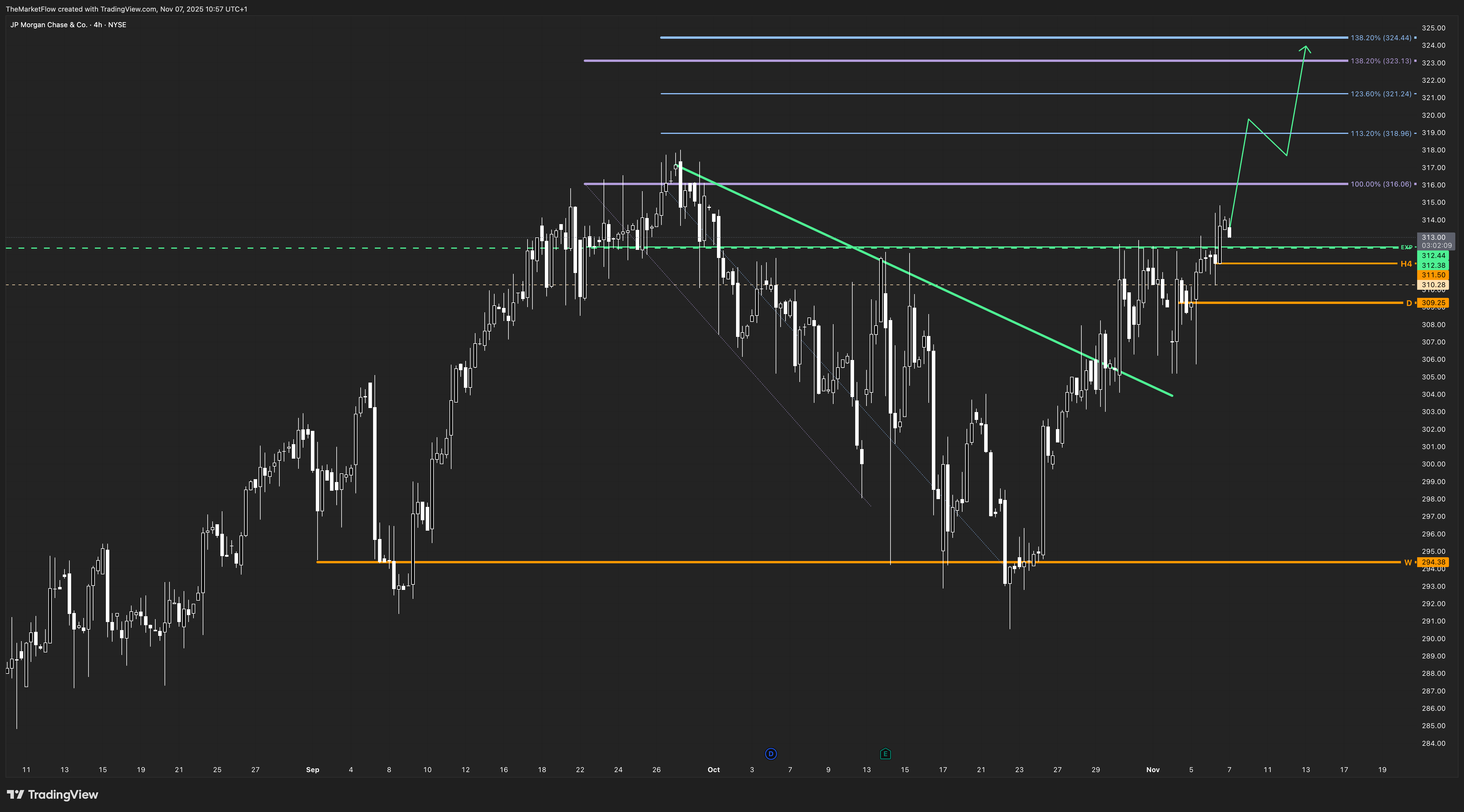 JPMorgan Chase remains in a confirmed multi-timeframe expansion, supported by aligned wave structure and clean breakout above both the countertrend and expansion level. The higher timeframe path targets 323.13-324.44, with structure remaining valid while above 311.50 intraday and 309.25 on the daily close.