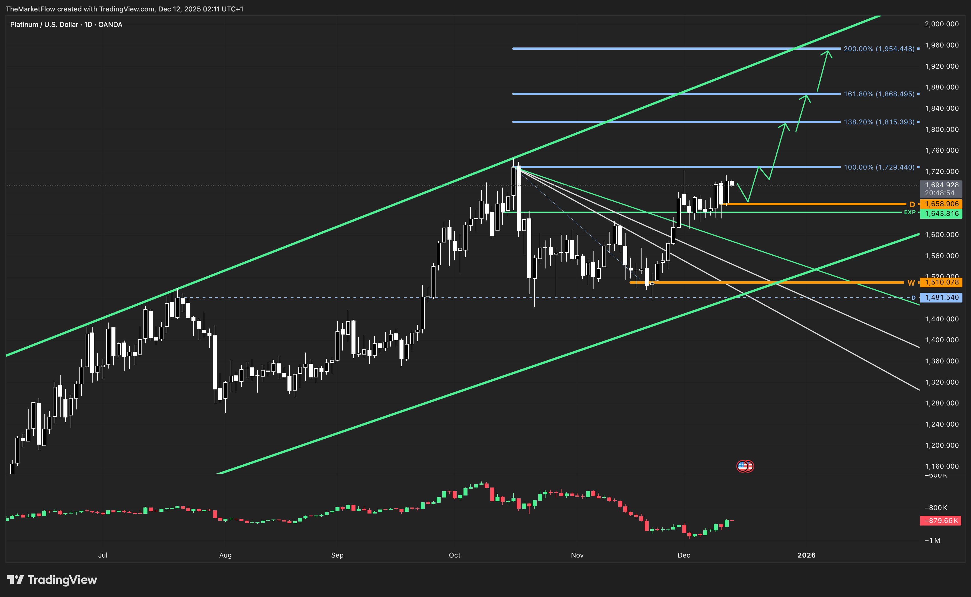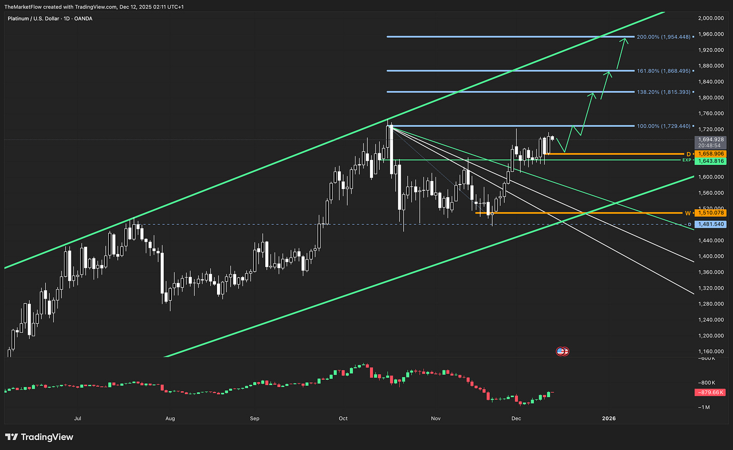 Platinum is advancing within a well-defined ascending channel, with expansion active above the daily pivot.