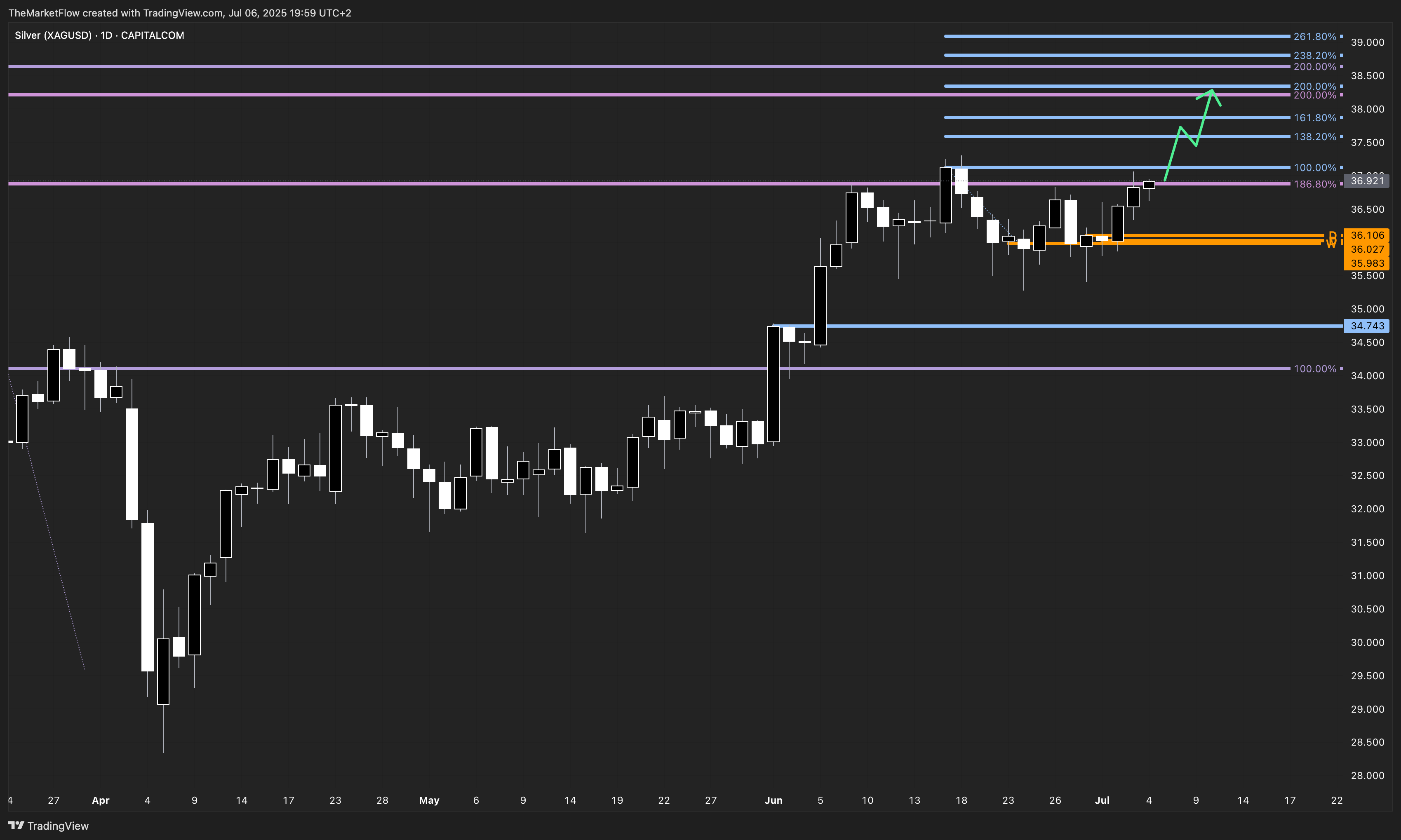 The setup remains valid as long as the daily pivot zone at $36.027–$36.106 holds. A breakdown below this area would challenge the continuation structure and call for reevaluation.
