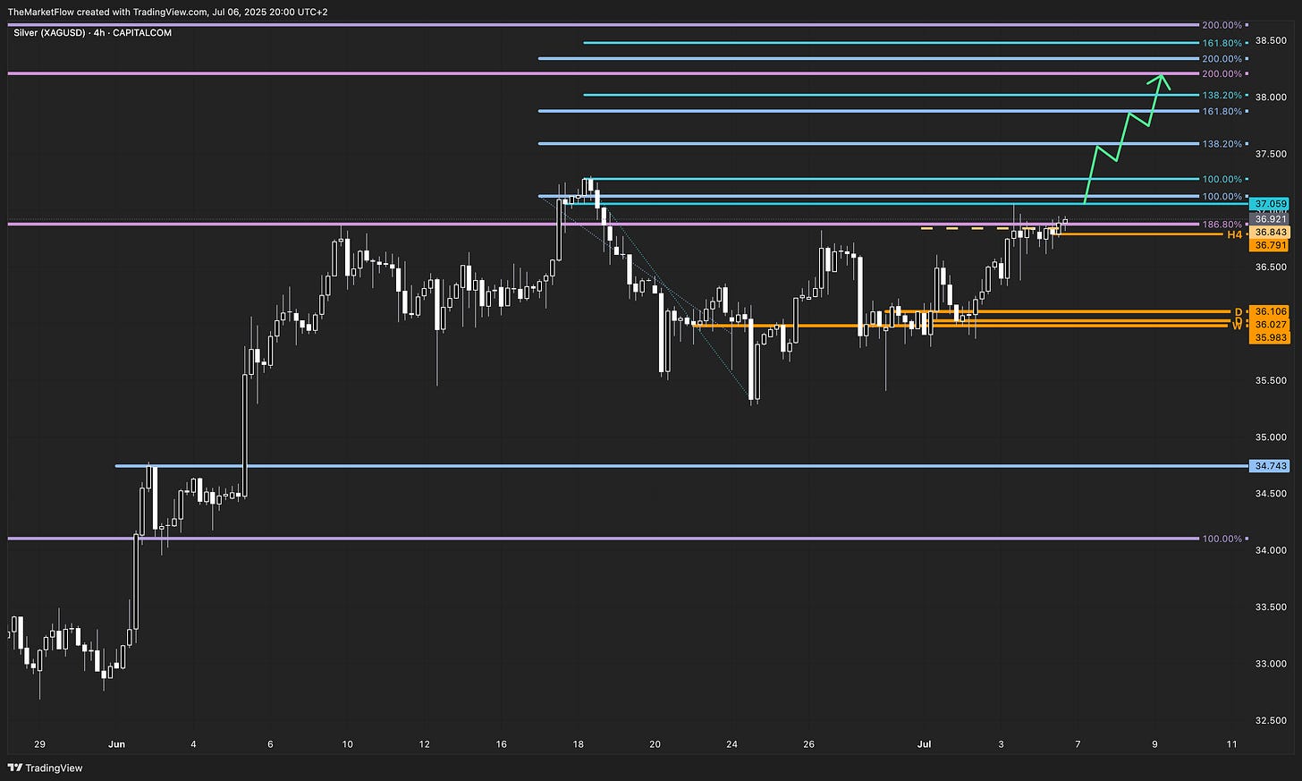On the H4 timeframe, a break above the H4 structure at $36.843–$36.921 activated a sequence of bullish target zones. The corrective leg down to the H4 pivot was respected, and the market has since resumed upward movement, supported by a clear countertrend break. The green arrow projects potential continuation into the target zone up to $38.20.