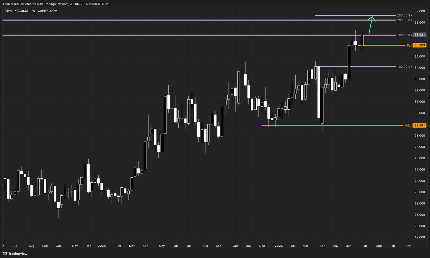 Daily structure confirms a clean bullish continuation following a period of consolidation. Price has cleared the prior resistance and is approaching the target Fibonacci cluster zone. The daily pivot level at $36.027 holds as a critical validation point for trend continuation. A bullish impulse from this zone has already begun forming, targeting higher Fibonacci extensions.